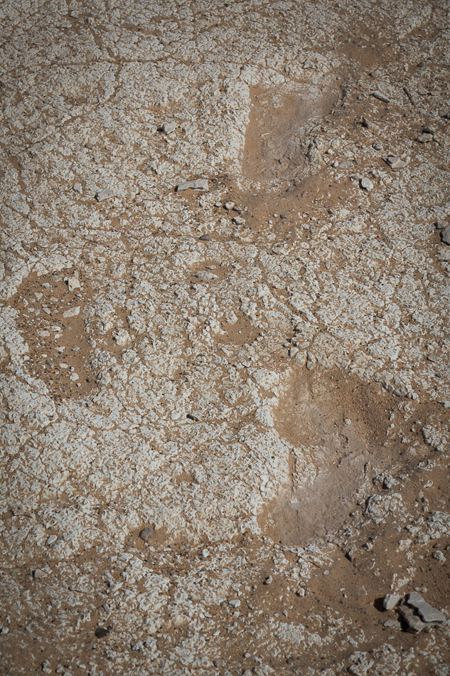 Empreintes de pas humains fossilisés dans un fond de lac. Région d'Azrag.